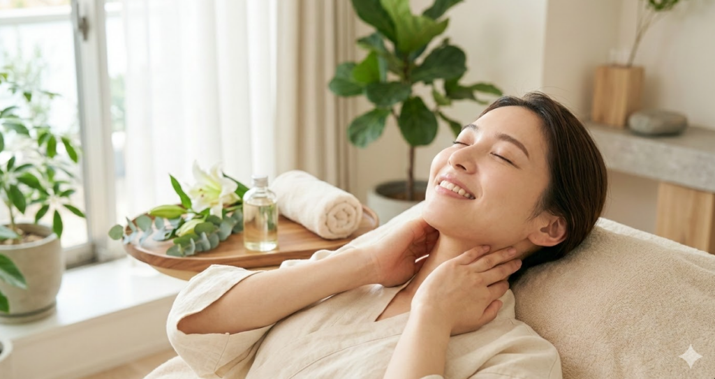肩甲骨周りを動かして胸を開くストレッチを行うと、首が本来のスッとした位置に保たれやすくなり、顎下のラインも自然と整いやすくなります。背中の緊張を解くことは、理想の小顔印象への隠れた近道なのです。